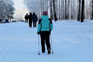 It’s important to have warm snow boots that have good traction on ice. Walking poles with spikes that can bite into ice can help provide stability while walking outside. External cleats (such as YakTrax) are also useful on slippery ice.